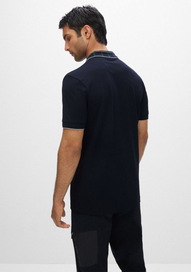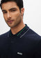 BOSS Paule 1 Polo T Shirt In White, Slim Fit. Constructed in a luxury cotton design with a three button opening at the neck featuring two visible branded black buttons and ribbed cuffs on the short sleeves. A ribbed polo collar in navy featuring the signature BOSS logo embroidered on the reverse of the collar in a blue design. The small signature BOSS logo is embroidered on the left of the chest in navy. Top stitching in white. 100% Cotton.